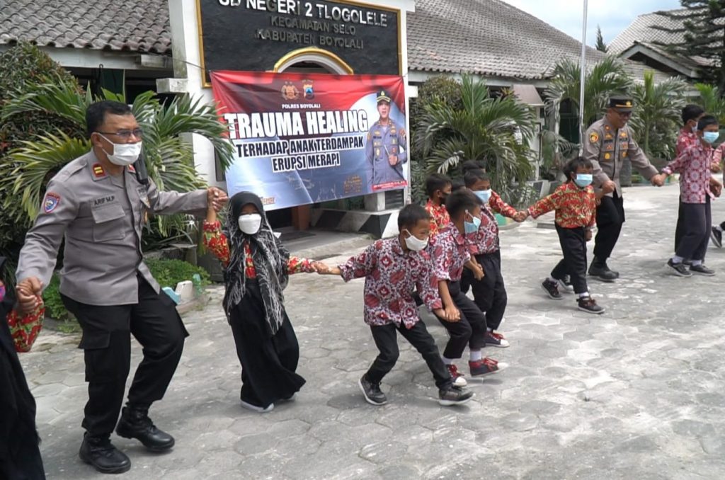 FOKUS JATENG-BOYOLALI- Sat Binmas Polres Boyolali menggelar pendampingan trauma healing di SD Negeri 2 Tlogolele, Kecamatan Selo, Rabu 15 Maret 2023 siang. Anak-anak yang bersekolah di kawasan rawan bencana (KRB) 3 Gunung Merapi ini diajak untuk bermain dan bernyanyi bersama. Anggota polres yang ramah membuat anak-anak bergembira mengikuti acara trauma healing ini.