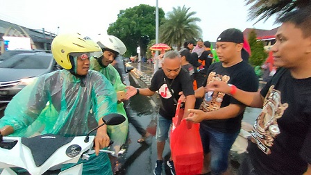FOKUS JATENG-SRAGEN – Ramadan tahun ini dimanfaatkan Paguyuban Sahabat Dangkel Sragen membagikan takjil gratis kepada pengguna jalan. Kegiatan yang berlangsung Minggu 2 April 2023 ini di bawah guyuran hujan. Selain pengguna jalan, takjil dibagikan untuk pemulung dan buruh pabrik.