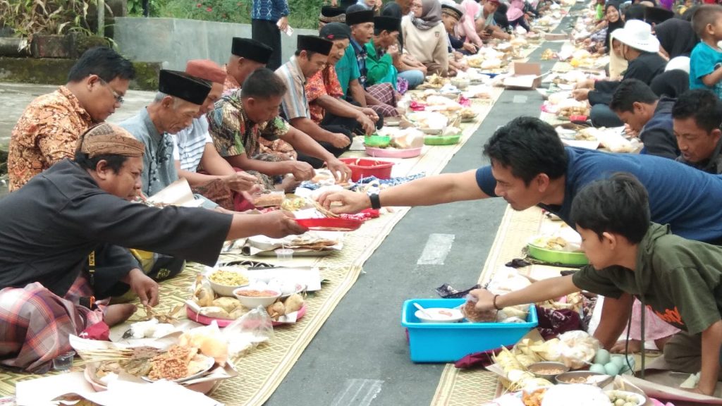 Tak hanya warga setempat, namun para pengunjung dari luar daerah pun diajak makan bersama. Bahkan warga semakin senang jika makanan yang dibawanya habis dimakan di tempat. Mereka memiliki keyakinan, semakin banyak makanan dimakan bersama, maka rezeki akan lancar. Sementara di kedua ujung jalan itu terdapat dua gunungan hasil bumi, nantinya setelah acara kenduri bakal dilakukan kirab bersama ratusan sapi milik mereka.