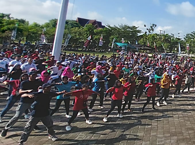 FOKUS JATENG-BOYOLALI- Seribuan pekerja mengikuti senam sehat, diawali apel bersama yang dihadiri Bupati dan Wakil Bupati Boyolali, Ketua DPRD, Ketua KSPN dan perwakilan perusahaan di Alun-alun kidul Pemkab Boyolali, pada 1 Mei 2023.