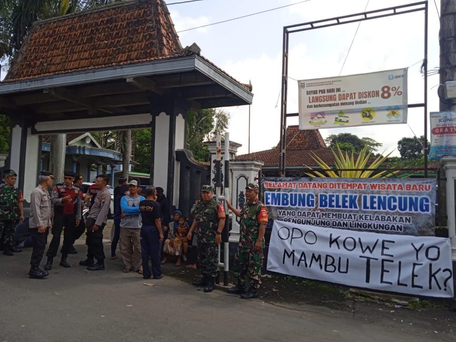 Sejumlah spanduk bernada protes terpampang di pagar kantor desa. Antara lain bertuliskan, Kami butuh bukti bukan janji; Opo kowe ya mambu telek ? Serta tulisan Selamat datang di tempat wisata baru embung belek lencung.
