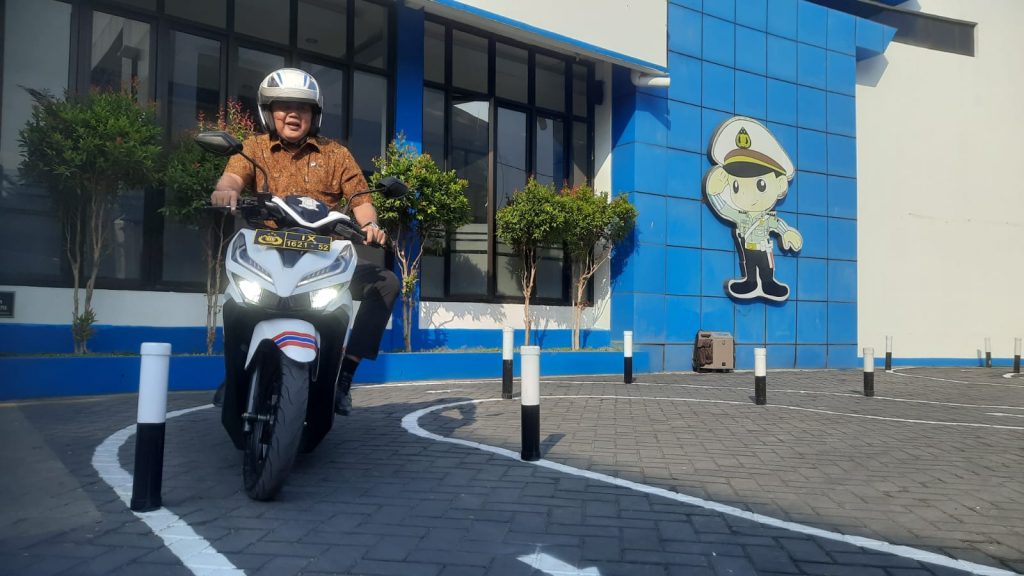 Bupati tak lupa menggunakan kelengkapan berkendara, seperti helm, Juliyatmono pun langsung mengendarai motor khusus ujian SIM milik Satlantas Polres Karanganyar.