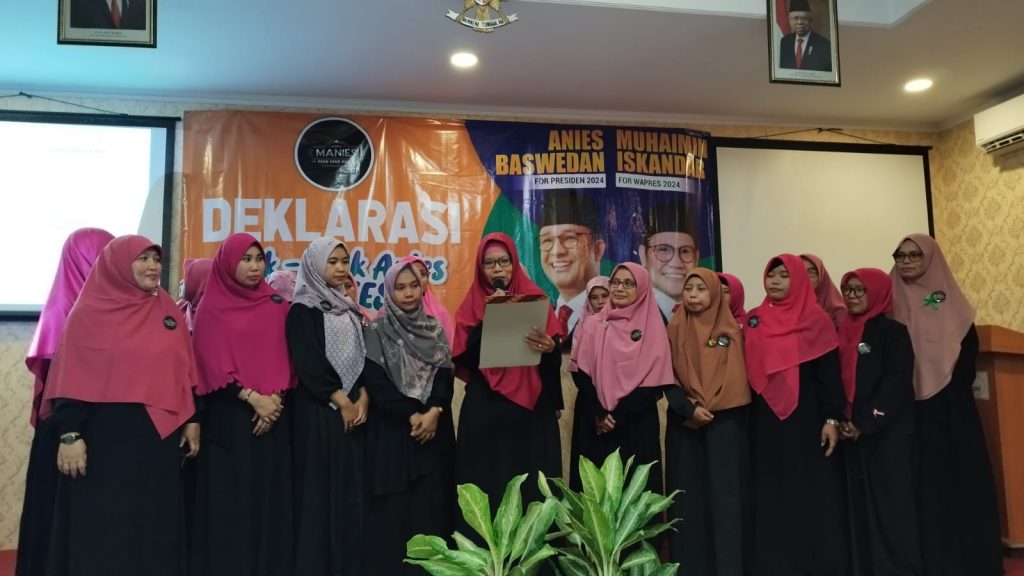 FOKUS JATENG-SOLO-Seratusan emak-emak di Solo Raya yang menamakan dirinya mak-mak Anies (Manies) menggelar deklarasi mendukung Anies Baswedan- Muhaimin Iskandar (AMIN), Sabtu, 23 September 2023, di Hotel Amrani Jalan Slamet Riyadi Solo Jawa Tengah. Deklarasi dukung AMIN oleh komunitas Mak-mak Anies (Manies) di Solo merupakan deklarasi ke 25 di Indonesia.