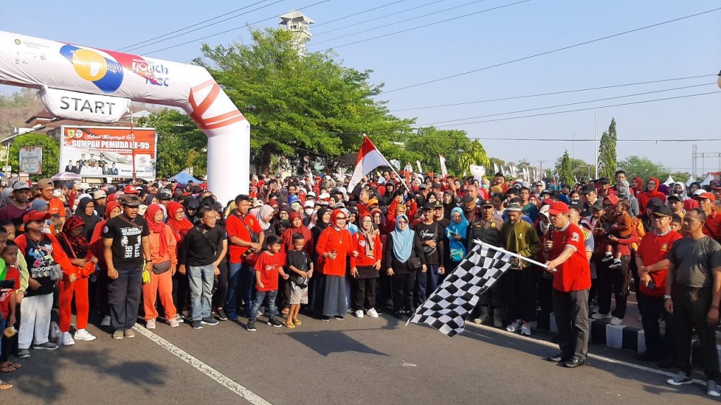 FOKUS JATENG-WONOGIRI Bupati Wonogiri Joko Sutopo mengibarkan bendera start tanda dimulainya jalan sehat yang di gelar pemerintah Kabupaten Wonogiri dalam rangka HUT ke-95 hari Sumpah Pemuda, di alon-alon Giri Krida Bakti, pada Minggu 29 Oktober 2023.