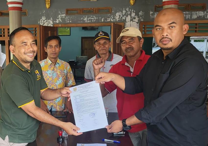 Kepala Desa Brajan, Kecamatan Mojosongo, Siswanto dan Kuasa Hukum pelaku pembuangan limbah, Joko Raharjo (baju hitam) bersama tokoh masyarakat setempat menunjukkan surat kesepakatan damai. (istimewa/Fokusjateng.com)