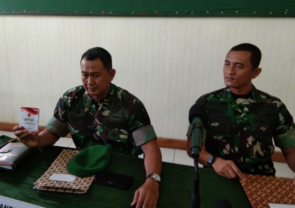 Komandan Kodim 0724/ Byl Letkol Inf Wiweko Wulang Wiwoho bersama Komandan Batalyon Infanteri Raider 408/SBH Kompi Senapan B Boyolali l Letkol Inf Slamet Hardianto memberikan keterangan pers di Makodim Boyolali (yull/Fokusjateng.com)