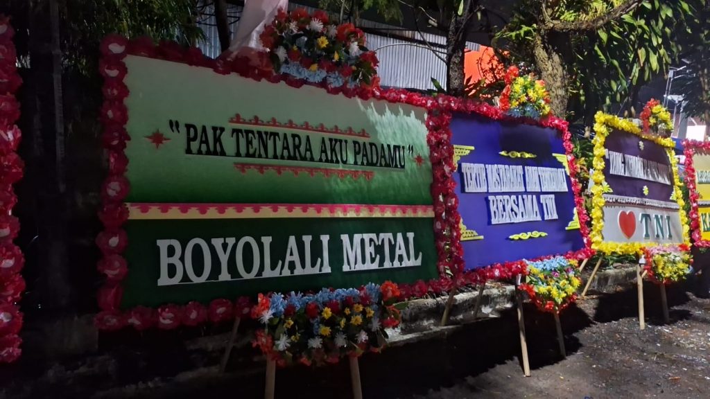 Puluhan karangan bunga itu sudah terpampang sejak Minggu 31 Desember 2023 lalu. Beberapa tulisan dalam karangan bunga antara lain, ‘Pak Tentara Aku Padamu’, ‘Tertib Masyarakat Aman Terkendali Bersama TNI’, ‘Yang Kemaki Harus Dibina’.