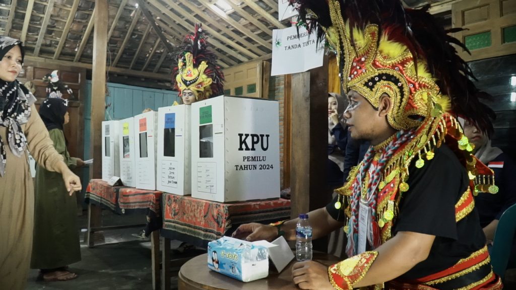 Fokus Jateng-BOYOLALI, -Petugas KPPS tempat pemungutan suara (TPS) 10 Desa Jagoan, Kecamatan Sambi, Boyolali, Jawa Tengah, mengusung tema kearifan lokal, mereka kompak mengenakan kostum penari topeng ireng (tarian khas Lereng Merapi) Rabu 14 Februari 2024.