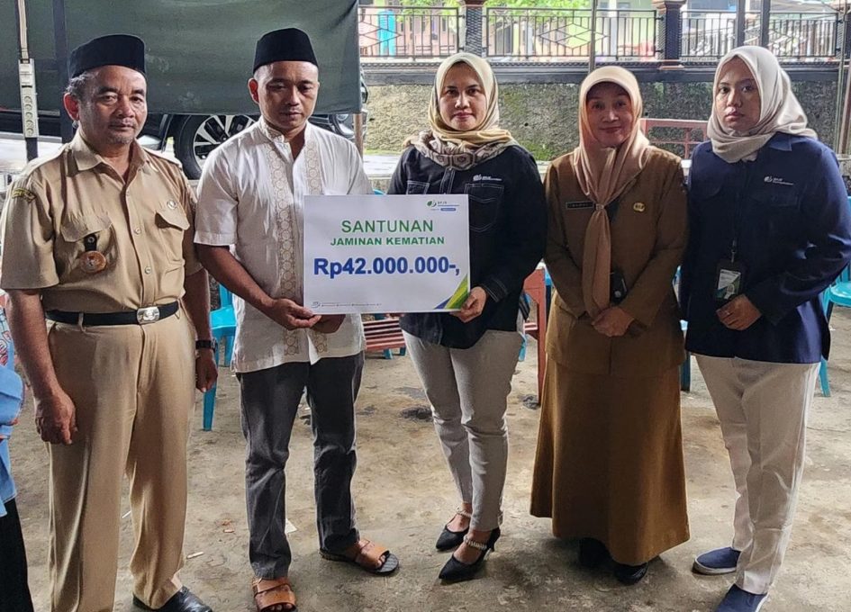 Fokus Jateng – BOYOLALI, – Sekretaris Daerah Kabupaten Boyolali, Wiwis Trisiwi Handayani bersama Kepala Kantor BPJS Ketenagakerjaan Cabang Boyolali, Lilis Muldiyastuti menyerahkan santunan jaminan kematian kepada ahli waris Giyanti, anggota KPPS 5 TPS 6 Desa Gubug Kecamatan Cepogo Kabupaten Boyolali.