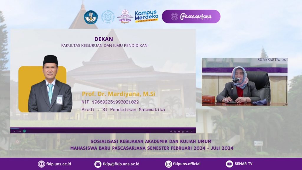 Fokus Jateng- SOLO, – Fakultas Keguruan dan Ilmu Pendidikan (FKIP) Universitas Sebelas Maret (UNS) Surakarta menggelar Sosialisasi Kebijakan Akademik dan Kuliah Umum Mahasiswa Baru Pascasarjana Semester Februari-Juli 2024 pada Rabu 6 Maret 2024, secara luring di Aula Lantai 3 Gedung G FKIP UNS dan daring melalui siaran langsung pada akun Youtube Semar TV.