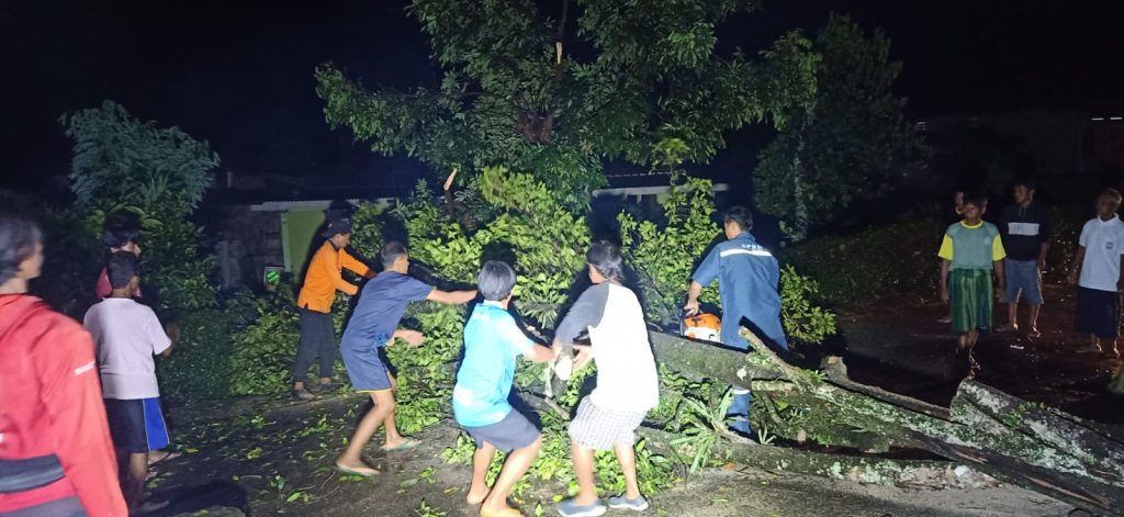 “Teman-teman TRC BPB bersama warga juga berupaya melakukan evakuasi pohon tumbang menutupi akses jalan penghubung desa di Dukuh Karanggondang, Rt.02/09, Desa Candi, Ampel.”