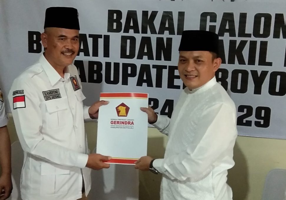 Kedatangan Fauzan ini pun disambut pengurus DPD Partai Gerindra, Sukardiyono, serta Pengurus DPC Partai Gerindra Boyolali. Sebelum mengambil formulir pendaftaran, relawan pendukung Fauzan berdiri untuk bershalawat bersama.