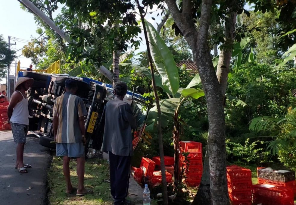 Fokus Jateng-BOYOLALI,- Sebuah truk pengangkut 3,5ton ayam potong terguling di ruas Jalan Raya Gondang Slamet- Sruwen, Kecamatan Ampel, Kabupaten Boyolali, Rabu 29 Mei 2024. Truk terguling karena lepas kendali saat melewati tikungan tajam di ruas Jalan Gondang Slamet-Sruwen.