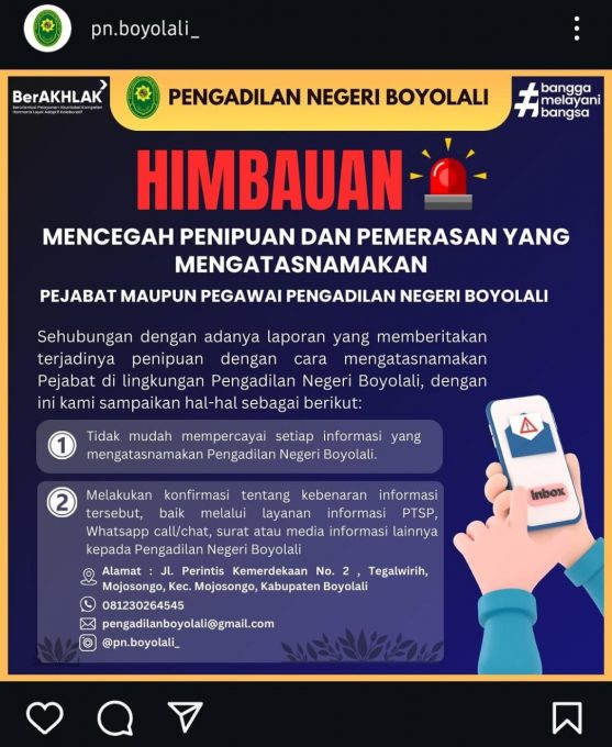 “Kemudian untuk mengantisipasi agar tidak terulang lagi, kami sudah mempublikasikan baik di web dan medsos kami. Imbauan agar masyarakat lebih berhati-hati dalam menerima informasi dan juga untuk konfirmasi ke PN jika ada hal-hal seperti itu,” pungkasnya.(yull/**)
