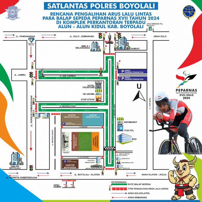 “Iya, kami sudah menyiapkan rekayasa pengalihan arus lalulintas saat berlangsungnya Para Balap Sepeda Peparnas XVII 2024 di kompleks perkantoran terpadu Alun-alun Kidul Pemkab Boyolali,” kata Kasatlantas Polres Boyolali, AKP Susilo Eko Nuardani, Rabu 9 Oktober 2024.