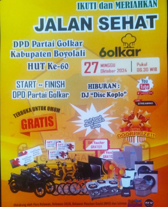 Fokus Jaten-BOYOLALI,-Ribuan warga kader Golkar dan simpatisan Golkar Boyolali bakal mengikuti gerak jalan santai dalam rangka HUT Golkar ke-60 tahun 2024, yang digelar DPD Partai Golkar Kabupaten Boyolali. Kegiatan ini juga dimaksudkan pada penguatan dan konsolidasi organisasi untuk merebut hati rakyat melalui kerja nyata. Hal ini didapat melalui pamflet informasi di Grup Whattsapp Golkar Boyolali.