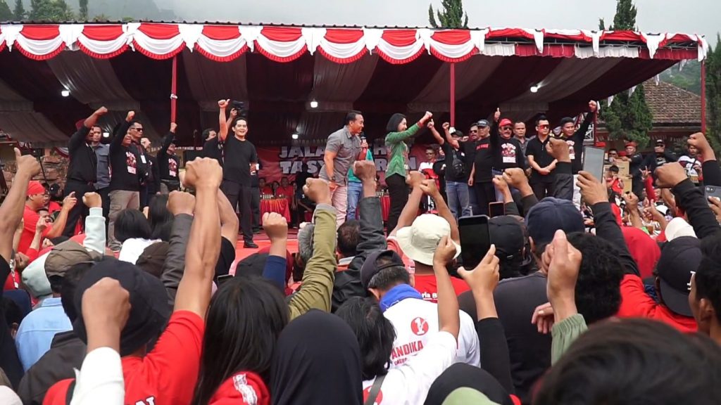 Fokus Jateng- BOYOLALI,-Calon Gubernur Jawa Tengah, Andika Perkasa. Pasangan nomor urut satu yang berpasangan dengan Hendrar Pribadi (Hendi) menggelar kampanye terbuka di Lapangan Selo, Boyolali, Minggu 3 November 2024. Andika yang datang bersama istrinya disambut meriah ribuan pendukungnya. Bahkan, sejak pagi para pendukung dan relawan sudah berdatangan di lapangan yang berada di lereng Gunung Merapi dan Merbabu tersebut. Acara semakin meriah mengingat dibarengi tasyakuran atas terpilihnya Didik Haryadi (Didik Melon) yang dilantik sebagai anggota DPR RI periode 2024-2025.
