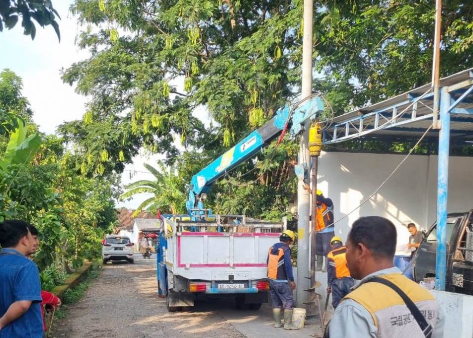 Petugas layanan listrik mulai memasang tiang listrik di lingkungan UD Pramono (doc/Fokusjateng.com)