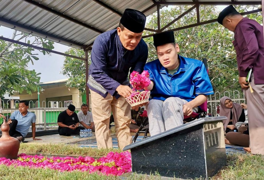 Turun dari mobil, cagub nomor urut 2 itu mendorong kursi roda yang digunakan putranya saat memasuki area pemakaman. Begitu mendekati makam istrinya, ia pun membopong putranya karena ada undakan yang tak bisa dilewati kursi roda.