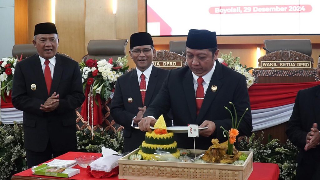 Ketua DPRD Boyolali Susetya Kusuma Dwi Hartanta memotong tumpeng Hari Jadi ke-74 DPRD Kabupaten Boyolali (doc/Fokusjateng.com)