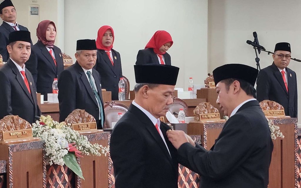 Ketua DPRD Boyolali Susetya Kusuma Dwi Hartanta menyematkan tanda keanggotaan DPRD Kabupaten Boyolali kepada Yusuf Ariyanto (yull/Fokusjateng.com)