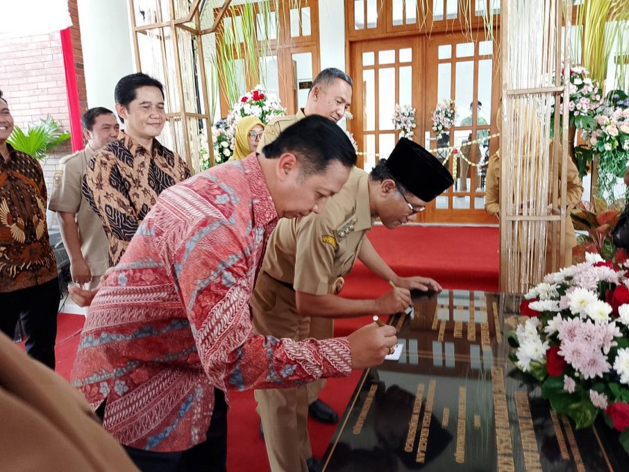 Tampak ketua DPRD Susetya Kusuma Dwi Hartanta dan Bupati Boyolali M. Said Hidayat menandatangani dan meresmikan kantor desa yang baru kepada pemerintah desa Kragilan, (yull/Fokusjateng.com)