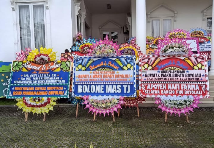Karangan bunga berjejer rapi berasal dari relawan, instansi pemerintah, perusahaan swasta, hingga partai politik. Deretan karangan bunga ini menjadi simbol apresiasi dan harapan besar dari berbagai pihak terhadap kepemimpinan baru di Kabupaten Boyolali.