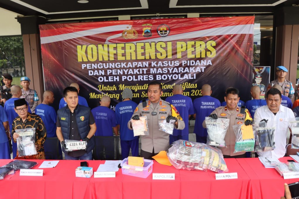 Konferensi pers yang digelar pada Jum’at 21 Februari2025 bertempat di Lobi Mapolres Boyolali dipimpin langsung oleh Kapolres Boyolali AKBP Rosyid Hartanto, didampingi Wakapolres KOMPOL Nunung Farmadi, Kasihumas, Kasatreskrim, serta Kasatresnarkoba. Hadir pula Ketua Forum Kerukunan Umat Beragama (FKUB) Boyolali, Habib Masturi.