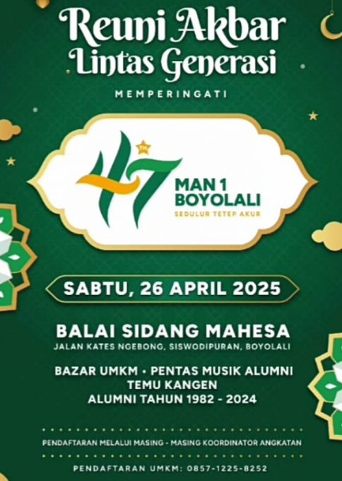 “Nah setelah itu kegiatan pertama kami adalah reuni akbar yang akan di selenggarakan insyaallah pada tanggal 26 April 2025 di Dome Balai Sidang Mahesa, Boyolali Kota,” paparnya.