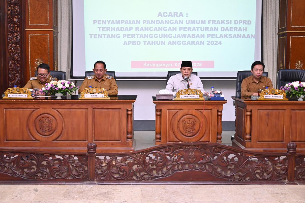 FOKUSJATENG.COM, KARANGANYAR – Dewan Perwakilan Rakyat Daerah (DPRD) Kabupaten Karanganyar menggelar Rapat Paripurna ke-12 Masa Sidang III Tahun 2025 pada Senin (7/7/2025) di Gedung DPRD Kabupaten Karanganyar. Agenda utama rapat adalah penyampaian pandangan umum fraksi terhadap Rancangan Peraturan Daerah (Raperda) tentang Pertanggungjawaban Pelaksanaan Anggaran Pendapatan dan Belanja Daerah (APBD) Tahun Anggaran 2024.