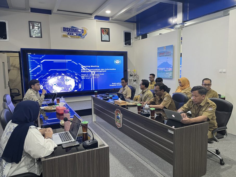 FOKUSJATENG.COM, KARANGANYAR – Audit ISO/IEC 27001:2022 tahap 2 secara resmi dimulai hari ini, Senin (21/7/2025), di Karanganyar. Audit ini krusial untuk memastikan Sistem Manajemen Keamanan Informasi (SMKI) Pusat Data Pemerintah Kabupaten Karanganyar telah memenuhi standar internasional. Proses audit akan berlangsung selama tiga hari, hingga Rabu mendatang.