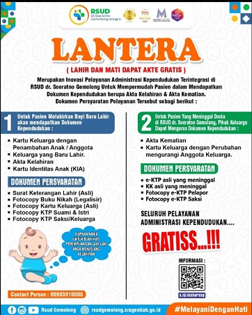LANTERA hadir sebagai jawaban atas hambatan klasik yang dihadapi masyarakat, terutama di daerah pedesaan, yang kerap kesulitan mengakses layanan administrasi kependudukan karena keterbatasan jarak, waktu, dan biaya. Melalui kerja sama antara RSUD dr. Soeratno Gemolong dengan Dinas Kependudukan dan Pencatatan Sipil, masyarakat kini dapat memperoleh akta kelahiran dan kematian secara gratis, cepat, dan mudah langsung dari rumah sakit.