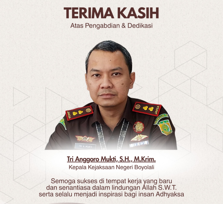 Untuk diketahui, selepas menjadi Kajari Boyolali, Tri Anggoro Mukti kini menempati jabatan barunya, sebagai Kepala Bagian Pengembangan Pegawai pada Biro Kepegawaian Jaksa Agung Muda Bidang Pembinaan Kejaksaan Agung di kantor Kejagung Jakarta. Ia digantikan oleh Ridwan Ismawanta, sebelumnya bertugas di Kejari Tebo, Jambi. ( yull/**)