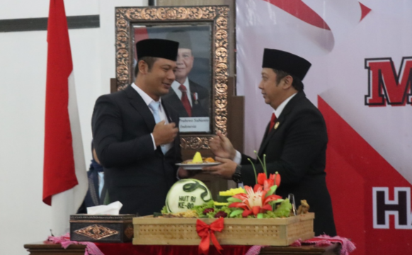 Sebagai wujud rasa syukur, dilakukan pemotongan tumpeng oleh Ketua DPRD Boyolali Susetya Kusuma Dwi Hartanta yang kemudian diserahkan kepada Bupati Boyolali Agus Irawan (doc/Fokusjateng.com)