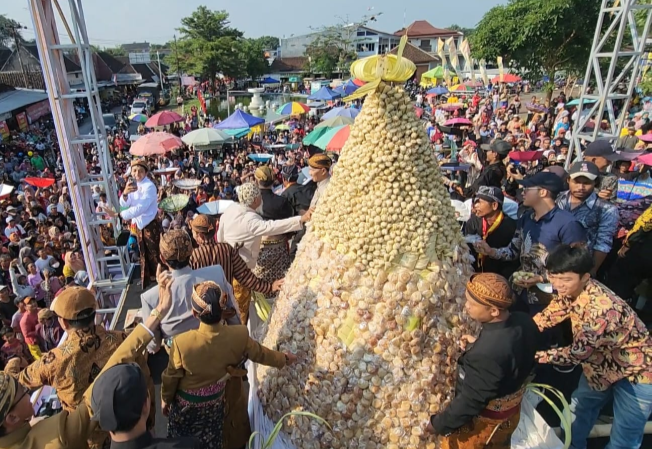 Setelah melalui sejumlah prosesi ritual, gunungan apem keong mas tersebut langsung dinaikkan ke panggung tinggi. Sontak, ribuan pengunjung yang sudah menunggu cukup lama langsung bersorak meminta apem segera dibagikan.