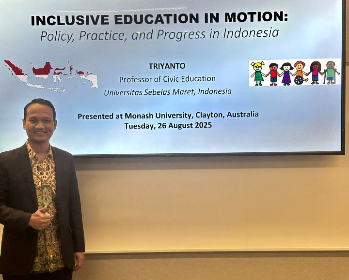 FOKUS JATENG– Guru Besar Universitas Sebelas Maret (UNS) Surakarta, Prof. Triyanto, menjadi dosen tamu di Monash University, Australia, pada 26 Agustus 2025. Dalam kesempatan itu, ia menyampaikan kuliah umum bertema inclusive education atau pendidikan inklusi dengan menyoroti pengalaman dan perkembangan di Indonesia.