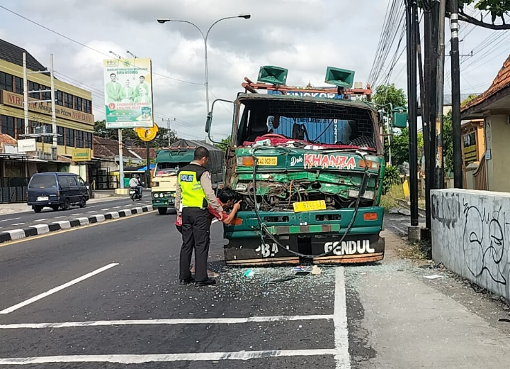 Sistem pengereman truk diduga mengalami kegagalan atau rem blong ketika melintasi pertigaan traffic light Wika Mojosongo.