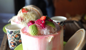 Di dalamnya, terdapat potongan roti tawar, aneka buah segar seperti semangka, melon, buah naga, dan nanas, yang kemudian disempurnakan dengan satu scoop es krim dan parutan keju melimpah. Untuk menjaga kesegaran, air kelapa muda asli disajikan dalam gelas terpisah.