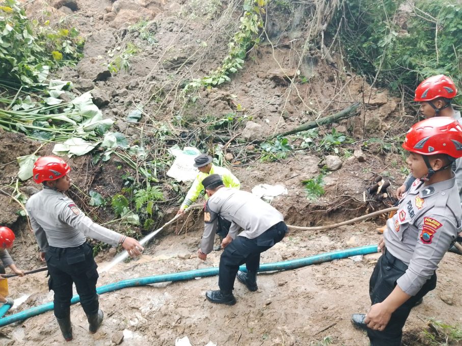 Setibanya di sana, aparat kepolisian langsung bergabung dengan anggota TNI, perangkat desa, serta puluhan warga sekitar. Dengan menggunakan peralatan seadanya seperti cangkul dan sekop, mereka bergotong royong membersihkan material longsor untuk membuka kembali aliran sungai.