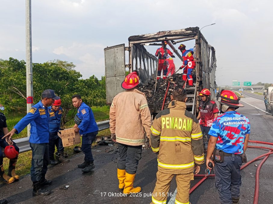 FOKUSJATENG.COM, KARANGANYAR – Panggilan darurat tak mengenal waktu, apalagi hari libur. Bagi tim Pemadam Kebakaran (Damkar) Satuan Polisi Pamong Praja (Satpol PP) Kabupaten Karanganyar, setiap alarm adalah pertaruhan nyawa dan kecepatan. Seperti pada Jumat (17/10/2025) siang, ketika sebuah truk kontainer ekspedisi ludes dilalap api di tengah jalan tol.