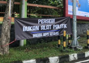 Salah satu spanduk bertuliskan “Persebi bukan alat politik”, spanduk lain juga bertuliskan “politik membunuh mimpi, suporter jadi saksi,”.