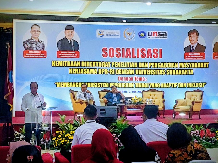 FOKUSJATENG.COM, KARANGANYAR – Anggota Komisi X DPR RI, Drs. H. Juliatmono, M.M., M.H., menekankan pentingnya transformasi pendidikan tinggi agar lebih adaptif dan inklusif dalam menghadapi tantangan zaman. Hal ini disampaikannya saat menjadi pembicara kunci (keynote speaker) dalam acara Sosialisasi Kemitraan Direktorat Penelitian dan Pengabdian Masyarakat di Universitas Surakarta (UNSA), Senin (22/12).