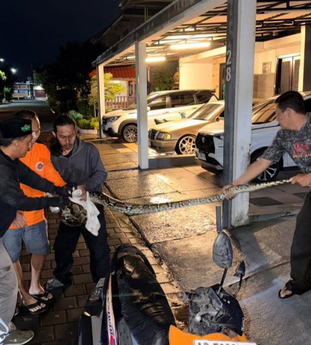 FOKUSJATENG.COM, KARANGANYAR – Keheningan malam di Perum Grand Permata, Ginung, Gajahan, Kecamatan Colomadu, mendadak berubah menjadi kepanikan. Seekor ular sanca kembang (Malayopython reticulatus) berukuran jumbo ditemukan menyelinap ke area pemukiman warga pada Jumat dini hari.