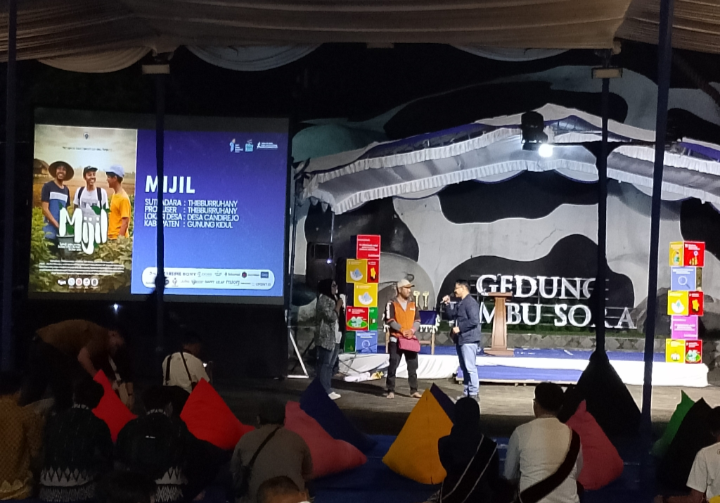 Fokus Jateng-BOYOLALI ,- Menteri Desa dan Pembangunan Daerah Tertinggal (Mendes PDTT), Yandri Susanto duduk lesehan bersama warga Boyolali menyaksikan layar tancap festival film desa bertajuk Bangun Desa, Bangun Indonesia di halaman Gedung Lembu Suro Kantor Setda Boyolali. Rabu 14 Januari 2026 malam