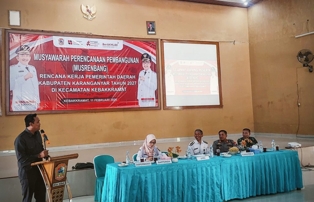 FOKUSJATENG.COM, KARANGANYAR – Wakil Ketua DPRD Kabupaten Karanganyar, Supriyanto, memberikan suntikan semangat bagi para kepala desa dan tokoh masyarakat dalam acara Musyawarah Perencanaan Pembangunan (Musrenbang) Rencana Kerja Pemerintah Daerah (RKPD) Tahun 2027 tingkat Kecamatan Kebakkramat, Rabu (11/2/2026).