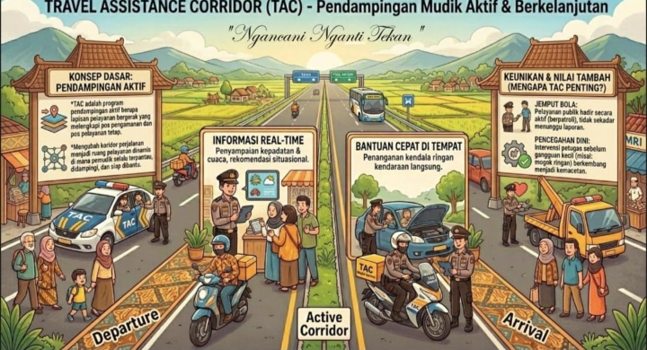 Program Travel Assistance Corridor (TAC) merupakan koridor pelayanan bagi para pemudik yang membutuhkan bantuan selama perjalanan, mulai dari informasi jalur mudik, kondisi lalu lintas, layanan kesehatan, hingga bantuan dari petugas kepolisian yang tersebar di sepanjang jalur mudik.