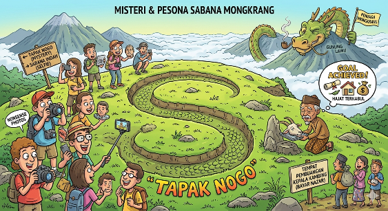 FOKUSJATENG.COM, KARANGANYAR – Angin dingin berhembus kencang di ketinggian 2.194 mdpl. Di ufuk timur, Gunung Lawu berdiri gagah berselimut kabut. Namun, bagi masyarakat sekitar dan para pendaki yang jeli, daya tarik Bukit Mongkrang bukan sekadar hamparan ilalang yang instagramable. Ada sebuah narasi tua yang tertanam di tanahnya: Misteri Tapak Nogo.
