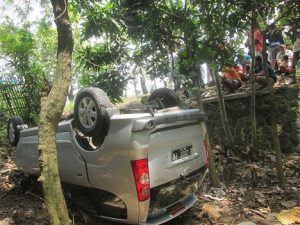 Senggolan dengan Bus Mira, Mobil Avanza Terbalik di Kebun Warga di Karangmalang Sragen