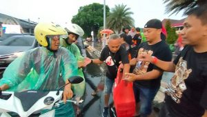 Sahabat Dangkel Sragen Bagikan Takjil untuk Pengendara di Bawah Guyuran Hujan